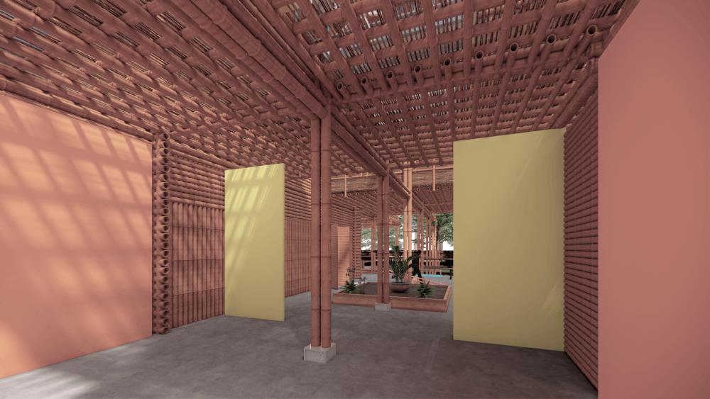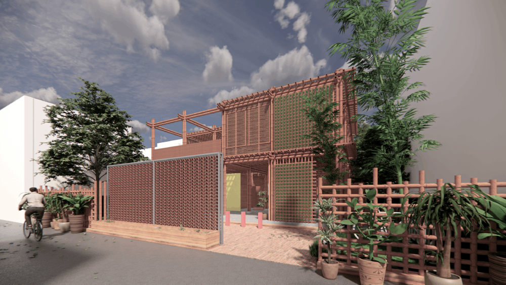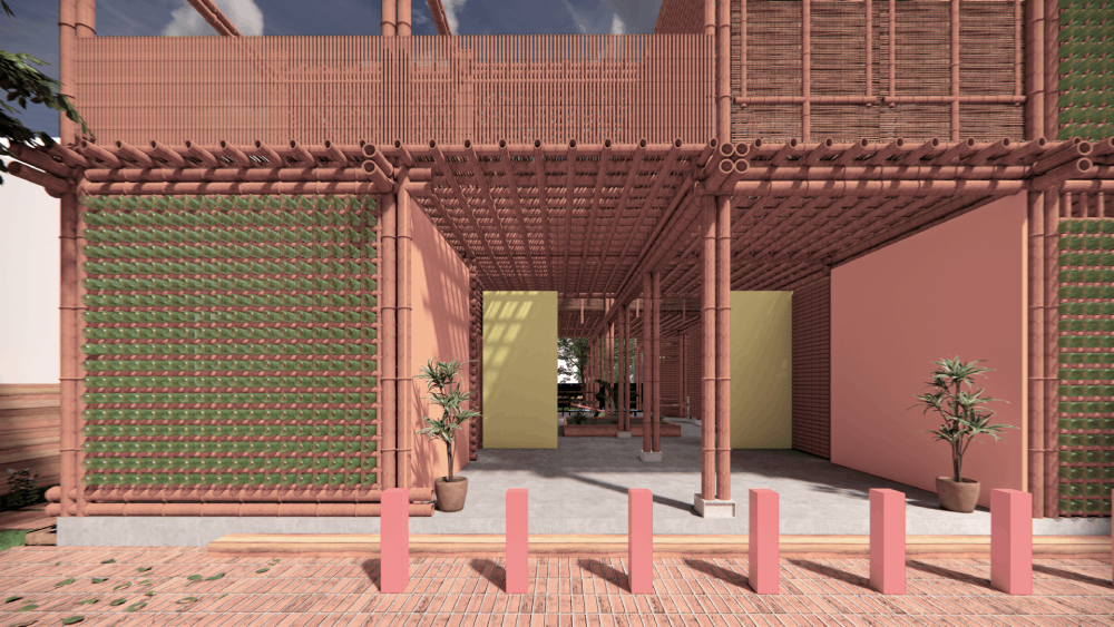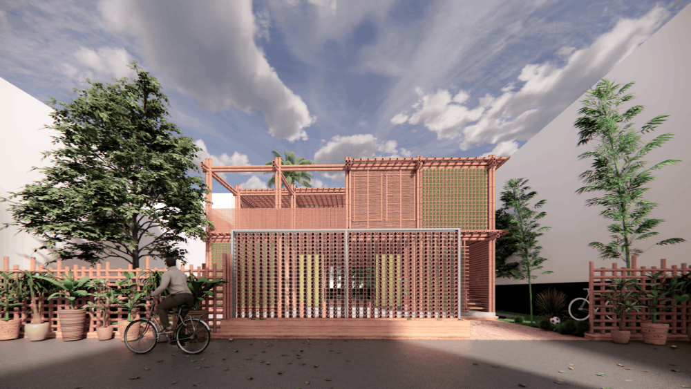 Facade is the main sustainable element.It is designed thoughtfully to cool down the hot air with the help of clay pots and water.The structure is designed in local available bamboo with thoughtful joinery.Overall the design is social and economical sustaibable.