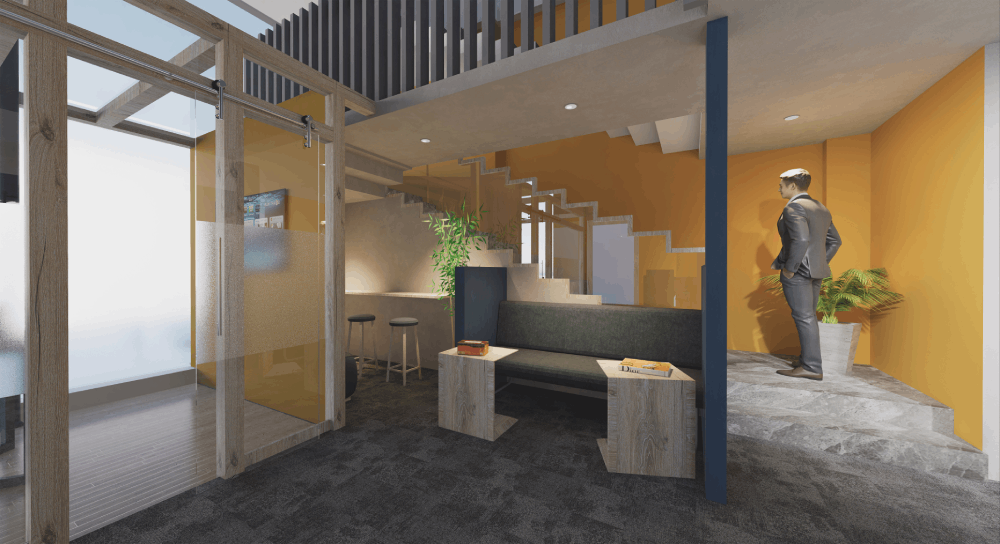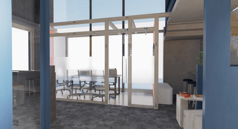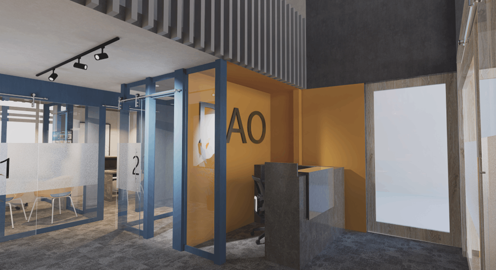 This depicts a modern minimalist office concept. Imagine a bright and airy space bathed in natural light thanks to the extensive use of white and sliding glass doors. This openness extends to the company culture, with the transparent design hinting at collaboration and information sharing. Clean lines and a lack of clutter dominate the design, prioritizing functionality and a sleek aesthetic. A large “DAO” wall potentially integrate the company’s brand identity, creating a sense of arrival for visitors.The overall concept suggests a professional, open workspace, possibly for a tech startup.